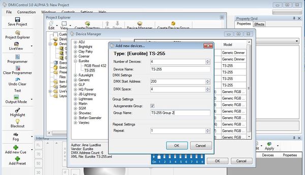 Im folgenden Schritt erstellen wir 4 Movinglights vom Typ "TS-255". Dort mußt du die angeforderten Daten eintragen, bitte achte darauf, dass du die richtige Startadresse vergibst.