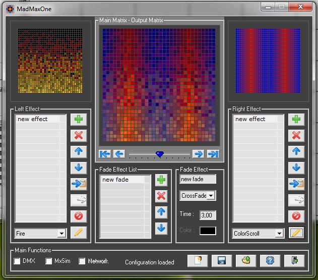 Mit dem Fader kann jeder Fadezustand manuell eingestellt werden. Ebenso sind mit den Buttons |< und >| die Matrizen rechts und links direkt anwählbar. Mit dem < und dem > Button wird ein Fade-Vorgang gestartet, der automatisch von A -> B, bzw. B -> A überblendet. Die Dauer dieses Vorgangs kann man im Feld „Time :“ einstellen. Im unteren Bereich des Fensters befinden sich die Buttons "Save" und "Load". Hiermit kann eine komplette Einstellung des Programms geladen bzw. gespeichert werden. Dabei werden folgende Sachen gespeichert: