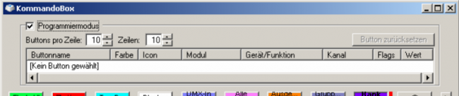 Das variable Kommandobox-Fenster lässt sich in seiner Größe den entsprechenden Erfordernissen anpassen, dabei werden die Buttons so skaliert, dass sie gleichmäßig auf das Fenster verteilt sind. Hierdurch lässt sich auch noch für andere Fenster auf dem Monitor Platz schaffen (z.B. grafische Bühnenansicht)