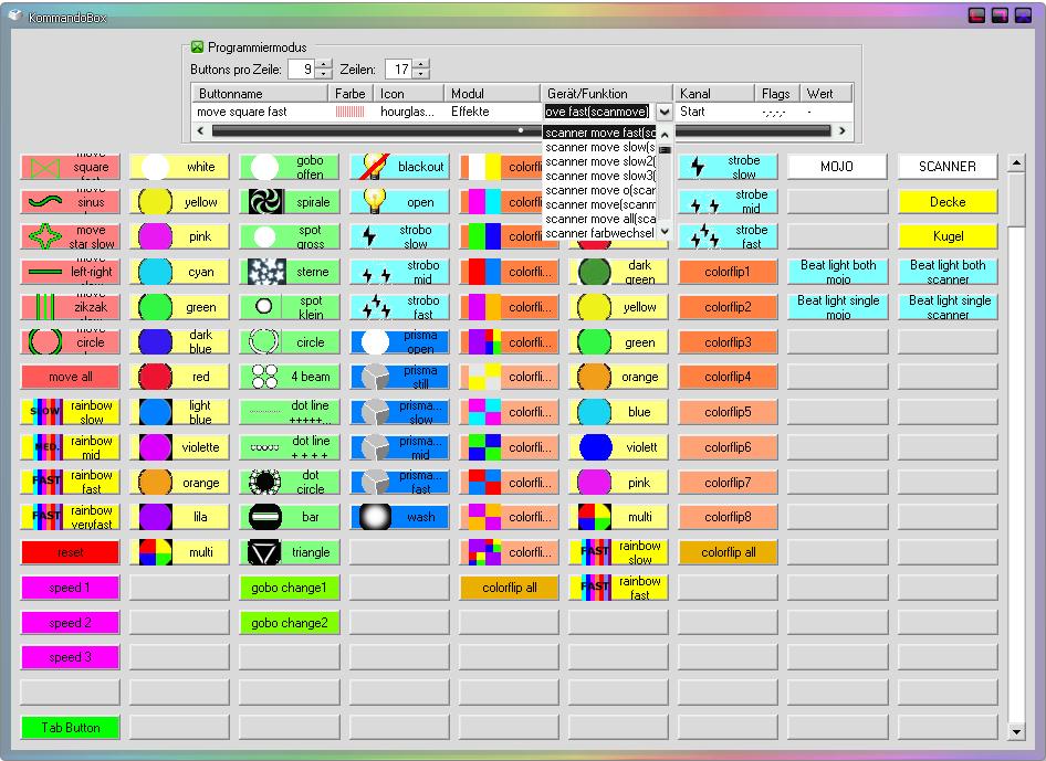 Bitte aktivieren Sie zum Belegen der Tasten den Programmiermodus. Dann können Sie einen der Buttons anklicken und im oberen Fensterteíl die Parameter verändern. Die Buttons führen ihre Funktionen erst wieder aus, nachdem Sie den Programmiermodus deaktiviert haben. Im Laufzeitmodus wird der zuletzt aktivierte Button durch einen Rahmen hervorgehoben, damit erkennbar ist, welcher Befehl gerade ausgeführt wird. Ein Effekt der in der Kommandobox bei Doppelklick die Funktion Start und Stop erfüllen soll, muss im Programmiermodus unter Kanal Start/Stop und unter Flags Umschalt-Modus zugewiesen bekommen. Dies geht mit jedem Befehl der unter Kanal den Start/Stop Eintrag stehen hat. Im Programmiermodus können die Buttons per Drag&Drop verschoben werden. Dazu muss der Button genau zwischen zwei Buttons losgelassen werden (dort wo die Linie erscheint). Tipp: Um das restliche Bild nicht zu verschieben, muß ggfs. eine ganze Zeile mit Buttons "aufgefüllt" werden. Hinweis: Zum "Löschen" eines Buttons müssen die Einstellungen zurückgesetzt werden. An das Flag Umschaltmodus der Befehle ist ein On/Off-Modus der Buttons gekoppelt. Hier erscheinen die Buttons bis zum nächsten Klick auch optisch dauerhaft gedrückt. Schauen Sie sich bitte auch den Tipp zur Farbigen Kommandobox an.