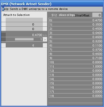 - 1. „GetSlice“ Er wird über den Input mit dem DMX ArtNet Knoten verbunden.