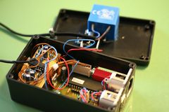 Schließlich folgt der Einbau ins Gehäuse. Für die XLR-Buchsen bohren wir zwei Löcher (nicht zu tief am Gehäuseboden, sonst passt die Transceiver-Platine nicht mehr hinein!), für die Transceiver-Platine müssen wir eine Aussparung für die DIP-Schalter und die LEDs fertigen. Für die Filter und Shifter Platine passen bereits zwei Befestigungsnippel, die Transceiver-Platine kann für einen Nippel passend gemacht werden. Auf der jeweils anderen Seite habe ich ein Holz eingeklebt, und die Platinen darauf verschraubt. Das Netzteil kleben wir (passend für das "Loch") im Gehäusedeckel fest.