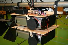Beamer-Klappen: BlackWrap an Modellbau-Servos mit Hoelscher-Hardware Vorteil dieser Beamer: Man kann eine Fernbedienungs-ID vergeben, der Umschalter befindet sich auf der Vorderseite der Fernbedienung. Ein seperates Bedienen beider Beamer war kein Problem.