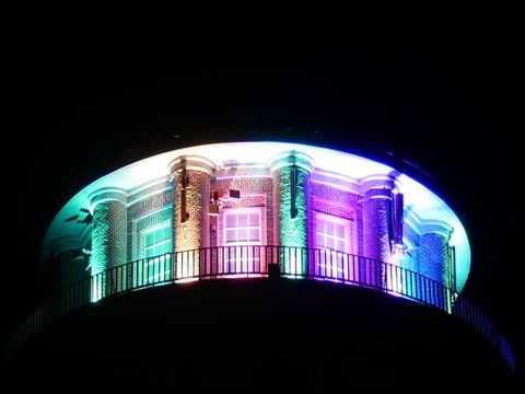 Danach haben einige freiwillige Helfer den Rest des Equipments (Strahler, Dimmer, Farbroller, Kabel) die 295 Stufen bzw. 55m nach oben getragen. Somit war es auch das erste DMXControl-Treffen mit Sportprogramm zur Gesunderhaltung der inzwischen alternden Mitglieder :) Eine WLAN-Verbindung sorgt für die nötige Anbindung aus dem "Mission Control Center" zur Turmspitze. Die Steuerung erfolgte aus dem alten Pumpenhaus via Artnet über 130m Luftlinie zu den Geräten (36-111MBit). Die Sichtbarkeit wurde dann von der 2km entfernten "alten Plauer Brücke" überprüft und für phänomenal sehenswert befunden!