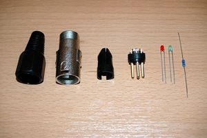 Diese Bauteile werden dann laut Schaltplan zusammengelötet, wobei die LED's "antiparallel" zueinander geschaltet werden. Antiparallel bedeutet: Beide LED's parallel zueinander, aber Anode (lang) jeweils an die Kathode (kurz) der anderen LED und umgekehrt. Das ist zwar ein wenig fummelarbeit aber durchaus noch einfach zu bewerkstelligen. Die LED's werden in Reihe mit dem Widerstand geschaltet, und dann zwischen die Stecker-Pins 2 und 3 gelötet. Nun folgt eine erste Funktionskontrolle. Den zusammengelöteten Stecker einfach in eine DMX-Out oder Anstelle des DMX-Geräts ans Ende des XLR-Kabels stecken. Wenn die beiden LED's leuchten, hat sich die Fummelei gelohnt. Nun die Höhe der LED's bitte so justieren, dass sie im verschraubten Zustand des Steckers leicht aus dem Steckergummi hinausgucken. ACHTUNG: Die Zugentlastung des Kabels kann nicht herausgenommen werden, da sie zum Spannen des Steckerinnenteils benötigt wird!! Nach einer weiteren Funktionskontrolle kann zur Sicherheit der Steckerinnenraum noch mit Silikon ausgefüllt werden. Dies schützt das Innenleben vor Feuchtigkeit und Erschütterungen.