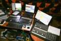 Ein Laptop war der Hauptcontroller der Show. Darauf ist DMXC 2.11 installiert. Ein weiterer Laptop fungierte als Fernbedieung für das Mediacenter, welches im Projektionsraum auf dem dritten Laptop befindet. Alle Laptops bis auf den Maincontroller sind über ein gesichertes WLAN angebunden. Ein Kabel in den Projektorraum legt sich nicht so einfach und ein relativ grosser Aufwand. Dafür nahmen wir in Kauf, dass eine Folie evtl. auch einmal zu spät ein- bzw. ausgeblendet wird.