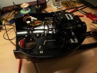 Links unten sind HQI-Starter und die große Drossel zu sehen, in der Mitte lugt der Reflektor hervor und rechts ist das Gobo-/Farbradsystem mit Shutter. Als erstes muss die Elektronik ausgebaut werden, um den oberen Lüfter ausbauen zu können. (Bild mit markierten Schrauben siehe am Fuße dieses Artikels). Die Platine mit XLR-Anschlüssen und Prozessoren ist mit nur einer einzigen kleinen Schraube befestigt. Danach hat man sie nach Abziehen der einzelnen Steckverbindungen und Lösen einer der beiden Trafoschrauben in der Hand (Stecker und Buchsen am Besten vorher mit nem Edding markieren!):