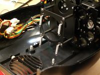 Daraufhin sollte man eine Ratsche mit flexibler Welle suchen (und natürlich finden), um die beiden selbstsichernden Muttern der Gehäuseschrauben erreichen zu können, die sich am Boden des Scanners befinden. Nach Lösen zweier weiterer Schrauben, die sich zwischen Reflektorwand und Goborad am Boden befinden, sowie der beiden Schrauben oberhalb des Reflektors, kann man den gesamten Lampenblock mit Trafo und Zündgerät herausziehen, wonach der Scanner nicht nur leichter, sondern auch ganz schön nackt aussieht:
