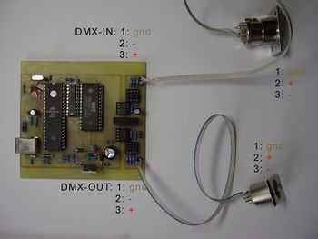 So, nachdem alle ICs drauf sind, bin ich den nächsten Schritt gegangen die Platine mal an den USB-Port zu klemmen und siehe da, DMXControl erkennt es. Alles wunderbar. Jetzt müssen noch die XLR-Buchsen dran, sodass ich das Interface einmal am Dimmer testen kann.