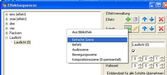 Das grüne Pluszeichen in der ersten Zeile rechts erstellt einen neuen leeren Effekt. In der Zeile bei "Effektname" geben wir sinnvollerweise "Lauflicht" ein. Kann natürlich auch irgendwie anders heißen, aber für ein Beispiel ist das schonmal ausreichend.