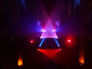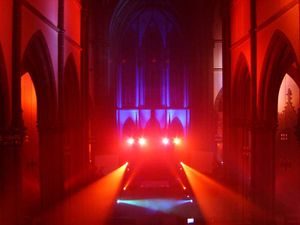 Anbei einige Eindrücke von der Show. Der Regenbogen (links) war ein szenisches Element der Show, der auch in den Videos der Show auftauchte. Die ruhende Lichtstimmung im Altarraum wurde ausschliesslich durch die LED-Pars erreicht, im Kirchenschiff waren die normalen PARs. Auf einigen Bildern erkennt man die Leinwände; es wurden 3 Beamer eingesetzt, die über das DE-MediaCenter und per Netzwerk angesteuert wurden.