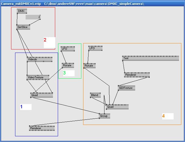 Diese Schritte werden im vvvv-patch durch die 4 farbigen Kästchen angedeutet. Der patch kann in dieser Reihenfolge Schritt für Schritt erstellt und getestet werden.